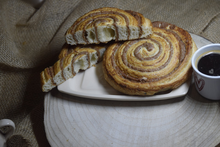 Sladké pečivo rovnomerne stočené do hniezda so škoricovou náplňou, balené.