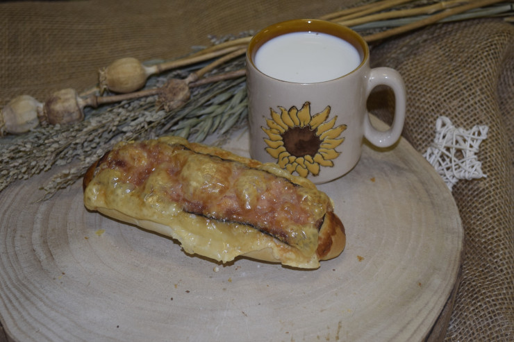 Rožok z pšeničnej múky na povrchu pokrytý slaninou a rozpusteným syrom.