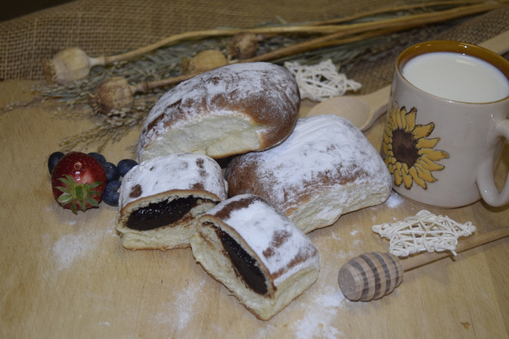 Buchty z pšeničnej múky plnené slivkovým lekvárom, na povrchu posypané práškovým cukrom.