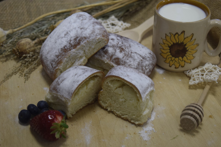 Buchty z pšeničnej múky plnené tvarohom. Na povrchu posypané práškovým cukrom.