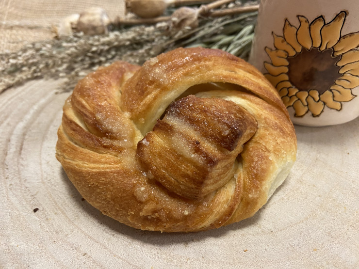 Pečivo z pšeničnej múky zapletené do uzla, na povrchu potreté cesnakovou pastou.