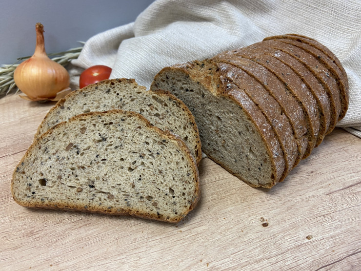 Pšenično-ražný ručne formovaný chlieb podlhovastého tvaru s viditeľnými zrnami. Krájaný, balený výrobok.