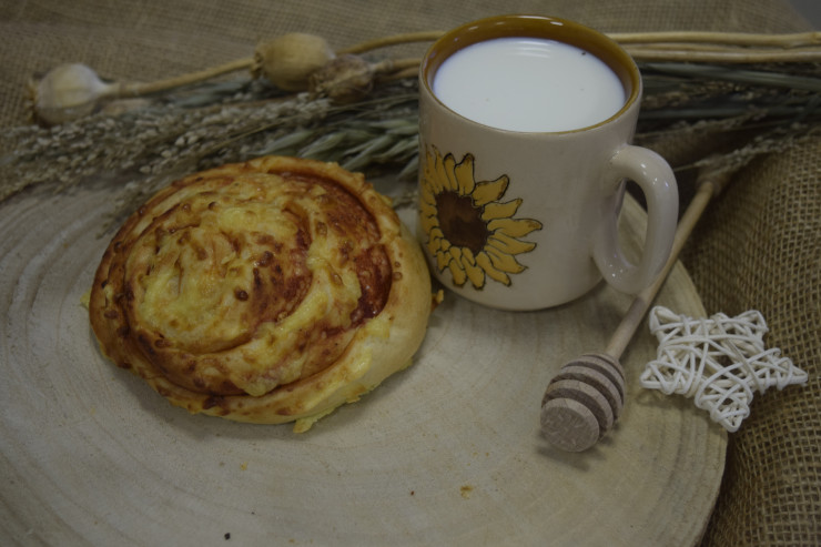 Pečivo z pšeničnej múky zavinuté do kruhu, na povrchu posypané syrom. Naplnené pizza náplňou.