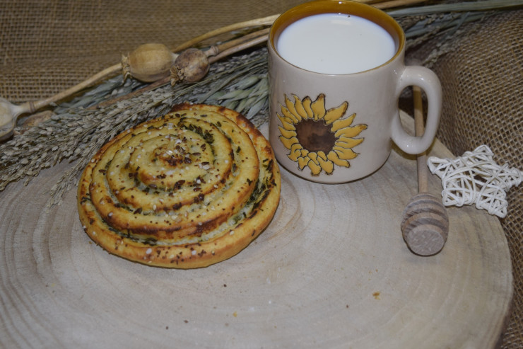Pečivo z pšeničnej múky rovnomerne sformované do tvaru okrúhleho hniezda. Naplnený syrovou náplňou, na povrchu posypaný ľanovými, sezamovými semenami a hrubou soľou.
