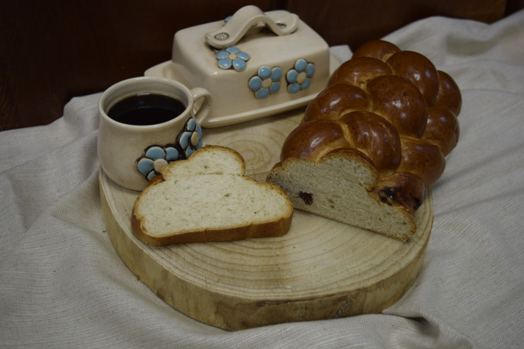 Rovnomerne sformovaná vianočka z pšeničnej múky zapletená do vrkoča. S pridanými hrozienkami. Balený výrobok.