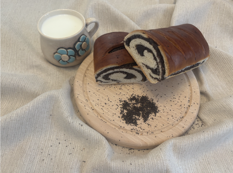 Rovnomerne sformovaný závin z pšeničnej múky v tvare obdĺžnika naplnený makovou plnkou. Balený výrobok.